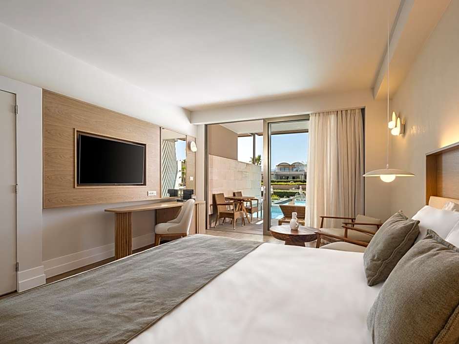 Spacious and elegant room with private pool and sunbathing terrace. It consists of 1 bedroom with seating corner and flat-screen LED TV 26''. The luxurious marble bathroom comes with separate bath and rain shower, bathrobes and slippers. A pool towel service is provided at no charge during your stay.